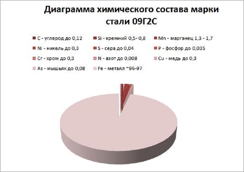 Химический состав конструкционной марки представляет собой сплав, который состоит из углерода и железа с небольшой примесью таких материалов, как: кремний, марганец, медь, азот, мышьяк, хром, никель, сера, фосфор и кремний. В зависимости от степени легирования в процентном соотношении сталь марки 09Г2С на 96-97% состоит из железа. При этом доля марганца может достигать 2%, кремния – 1%. В случае, если общий процент легирующих компонентов не превосходит 2,5%, сталь считается низколегированной.