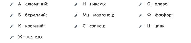 Понять, что перед вами бронза, сплав меди, можно по первым буквам «Бр», присутствующим в маркировке. После них ставятся буквы, по которым можно узнать, какие еще металлы, кроме меди, содержатся в химическом составе данного сплава. Нормативным документом установлены следующие правила обозначения химических элементов, присутствующих в составе бронзы: