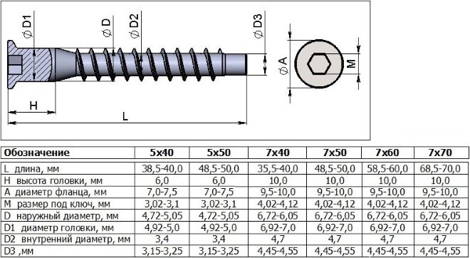 Использование конфирматов позволяет соединять мебельные элементы, изготовленные не только из натуральной древесины, но также из продуктов ее переработки – МДФ и ДСП. По соотношению наружного диаметра резьбы и длины винта крепежные изделия данного типа представлены на современном рынке в следующих типоразмерах: 5х40, 5х50, 6,3х40, 6,3х50, 7х40, 7х50, 7х60 и 7х70 мм. При этом наиболее популярными являются еврошурупы, длина которых составляет 50 и 70 мм, а диаметр резьбы – 7 мм.