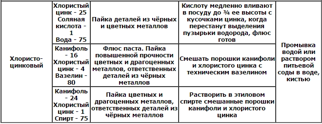 Большое значение для получения качественного и надежного соединения латунных изделий при помощи пайки имеет правильный выбор флюса. Для успешного осуществления этого процесса не подойдет обычный флюс, в составе которого содержатся спирт и канифоль. Такой флюс из-за достаточно невысокой активности входящих в него компонентов не способен растворить окисную пленку, обязательно присутствующую на поверхности изделия из латуни. Именно поэтому для пайки изделий из латуни необходимо использовать более активный флюс, в качестве которого часто применяют хлористый цинк.