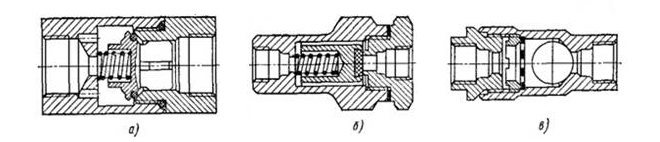 Обратные клапаны с конусным (а), плоским (б) и сферическим (в) запорными элементами