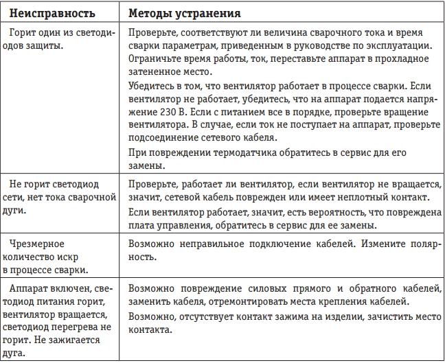 Другие неисправности ARC модели 205, которые устраняются силами самого сварщика, могут быть связаны с нарушением полярности подключения сварочных кабелей (сильное искрение при сварке), повреждением кабелей и их некачественным подключением (не зажигается дуга). Устранение более сложных неисправностей лучше доверить квалифицированным специалистам.