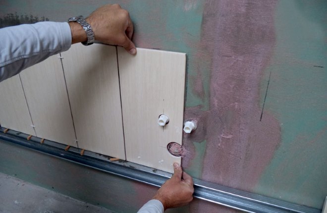 - Если отверстие большого диаметра необходимо выполнить в плитке, которая еще не зафиксирована на стене, изделие укладывают на ровную и жесткую поверхность и фиксируют.