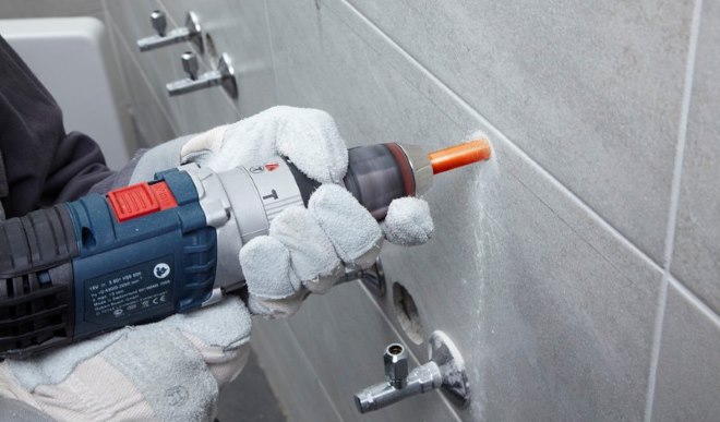 - После того как плитка просверлена насквозь и режущая часть инструмента достигла поверхности бетонной или кирпичной стены, сверло для работ по керамике необходимо заменить на более подходящее. Для формирования отверстия в стене, на которой закреплена уже просверленная плитка, можно использовать ударный режим работы дрели или перфоратора.